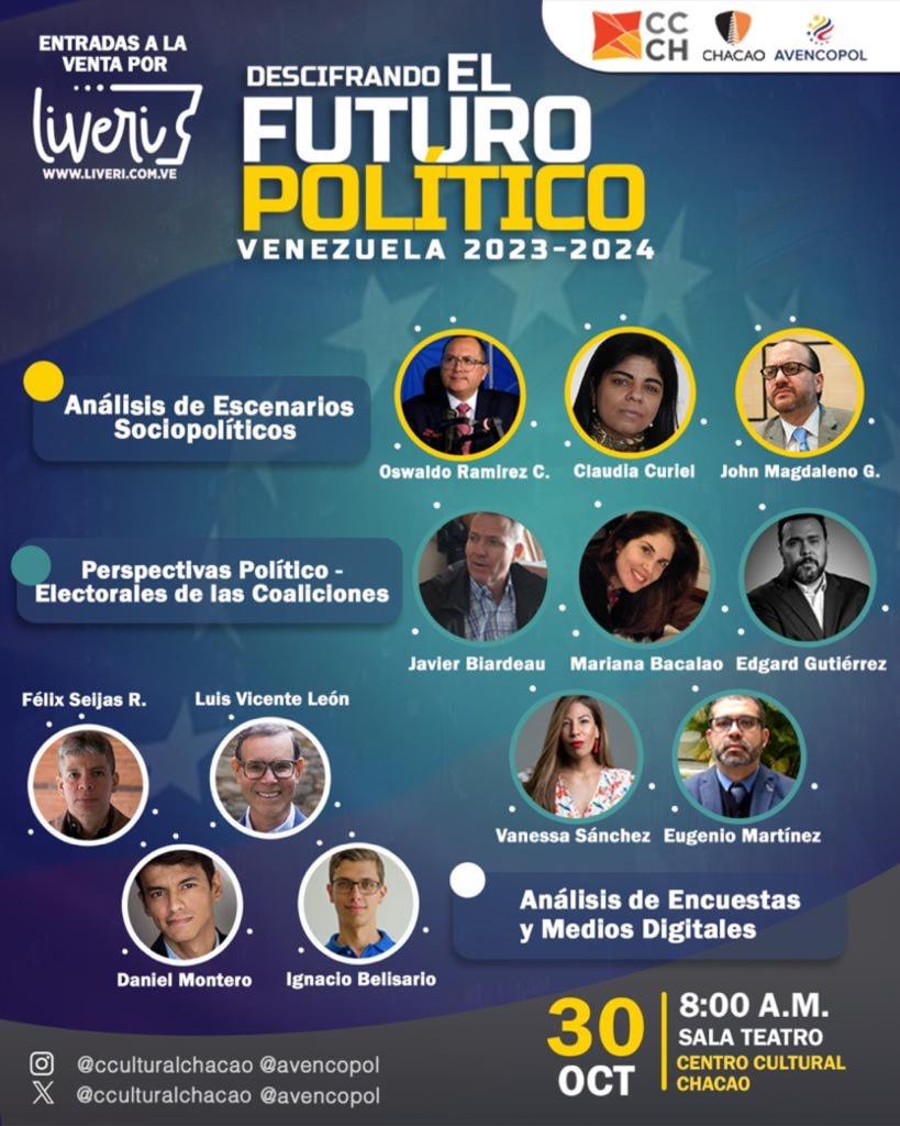 AVENCOPOL, la Asociación Venezolana de Consultores Políticos, invita a la ciudadanía venezolana a participar en el evento “Descifrando el Futuro Político. Venezuela 2023 – 2024”, luego de haberse vivido en el país una elección Primaria autogestionada, el pasado 22 de octubre. El evento de AVENCOPOL se llevará a cabo el lunes 30 de octubre de 2023, en el Centro Cultural Chacao.