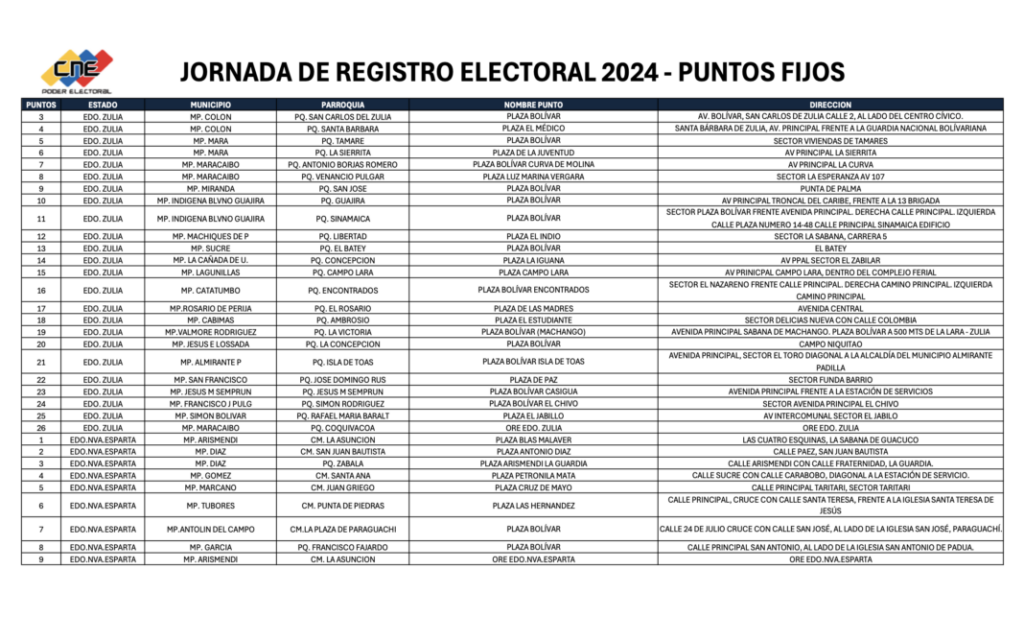 El Consejo Nacional Electoral (CNE) publicó la lista de los puntos habilitados para la inscripción y actualización de datos del Registro Electoral, que iniciará desde este lunes 18 de marzo hasta el 16 de abril.