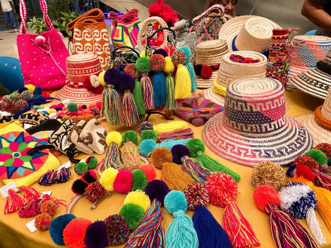 Carteras, bolsos, dulcería, llaveros, cuadros y mantas guajiras forman parte de esta exhibición.